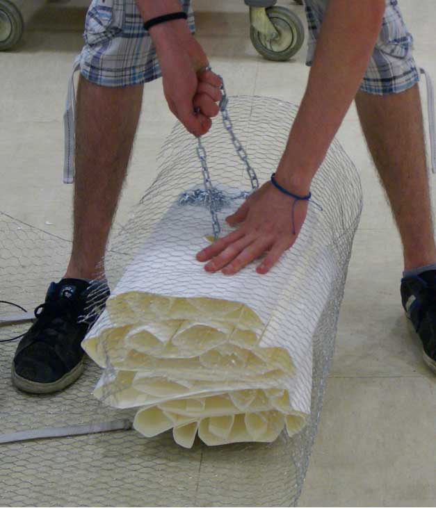 Foto: © Museu Molí Paperer de CapelladesLes làmines de paper de pasta de pi s’enfilen en una cadena i s’embolcallen dins d’una malla de galliner.